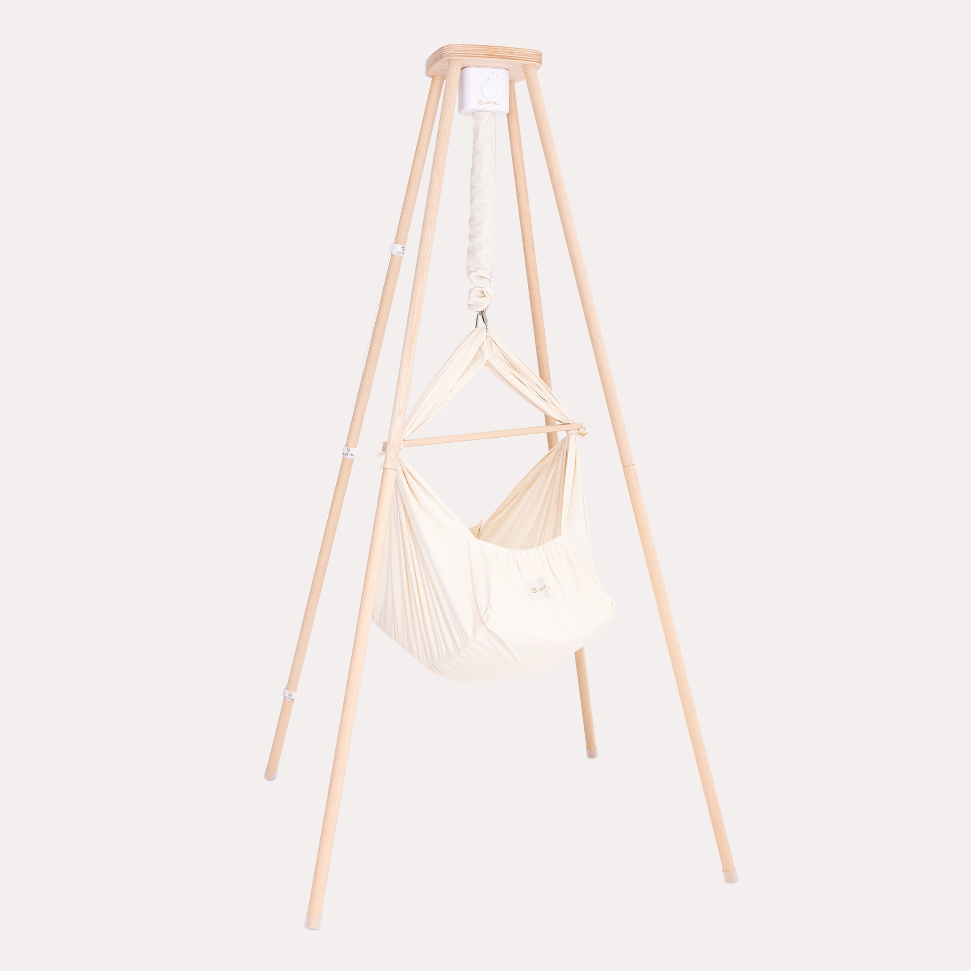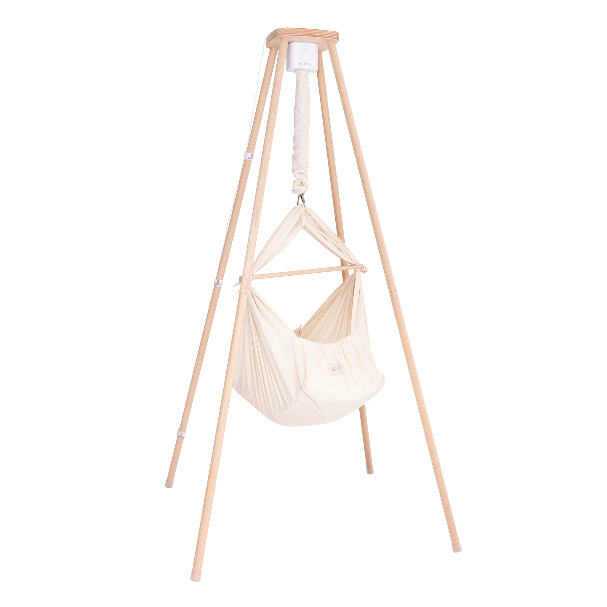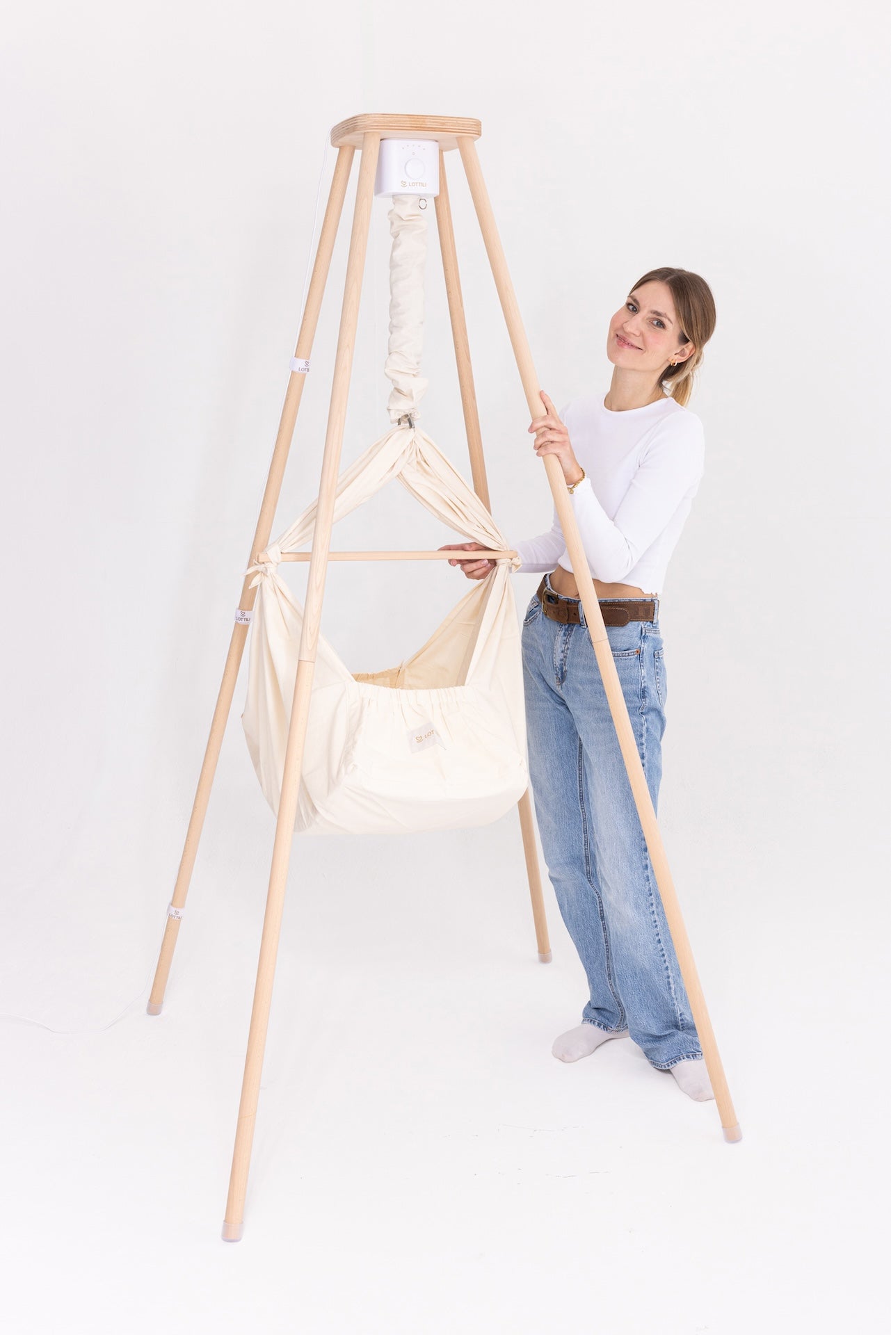 One Baby Hammock is a special type of cradle that is suspended from a spring and moves up and down. These gentle up and down movements are particularly soothing for babies and remind them of the gentle movements in the womb. Baby Hammock The classic cradles have become popular worldwide in recent years, although they were originally common in South East Asia. The classic set of Baby Hammock with motor and frame from Lottili offers you and your child an innovative Baby Hammock with a focus on comfort and safety.