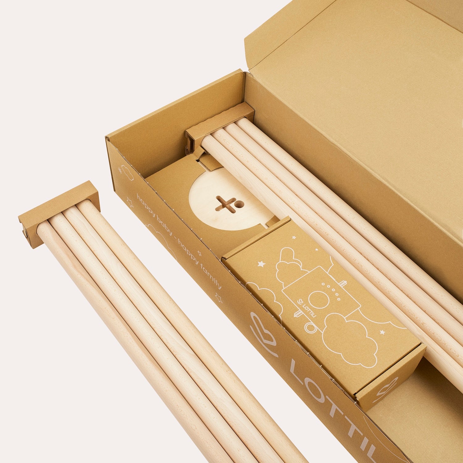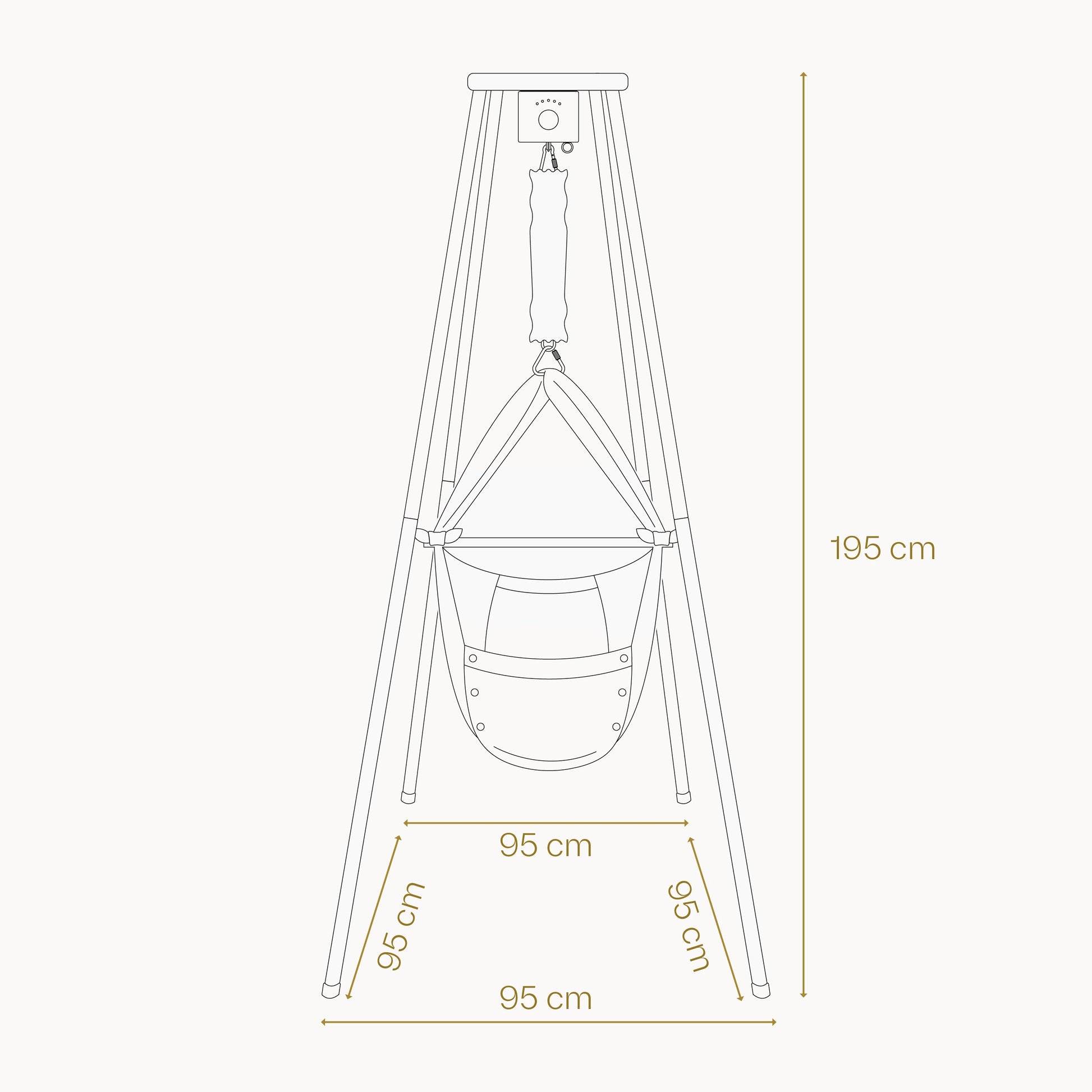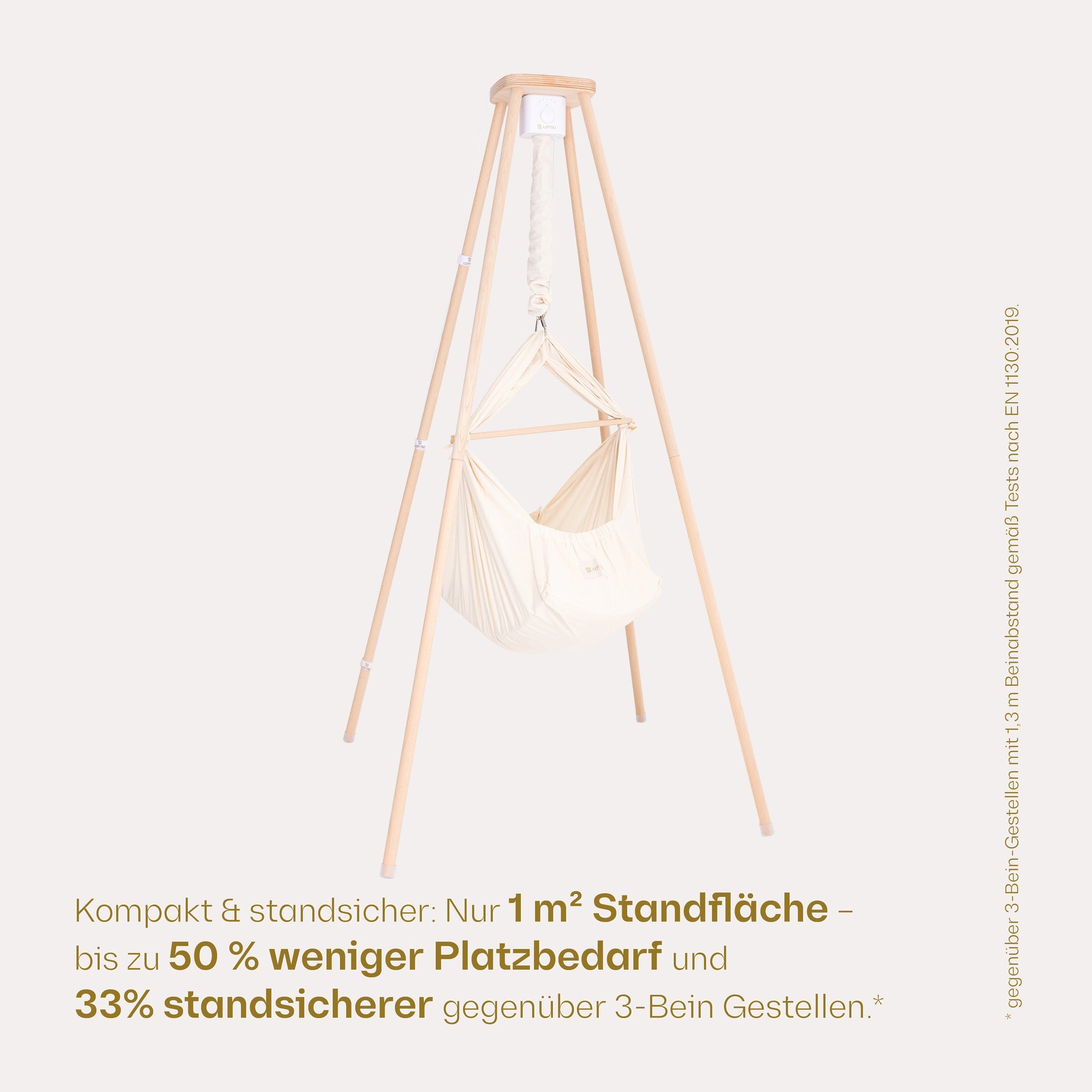 Our wooden frame, handmade in a Bavarian turnery, stands out from conventional steel frames with its stylish Scandinavian design. This innovative Baby Hammock frame not only impresses with its low weight of just 4 kg, but also with its robust and stable construction. Thanks to its compact footprint of around 1.2 square meters, it fits flexibly into any room.