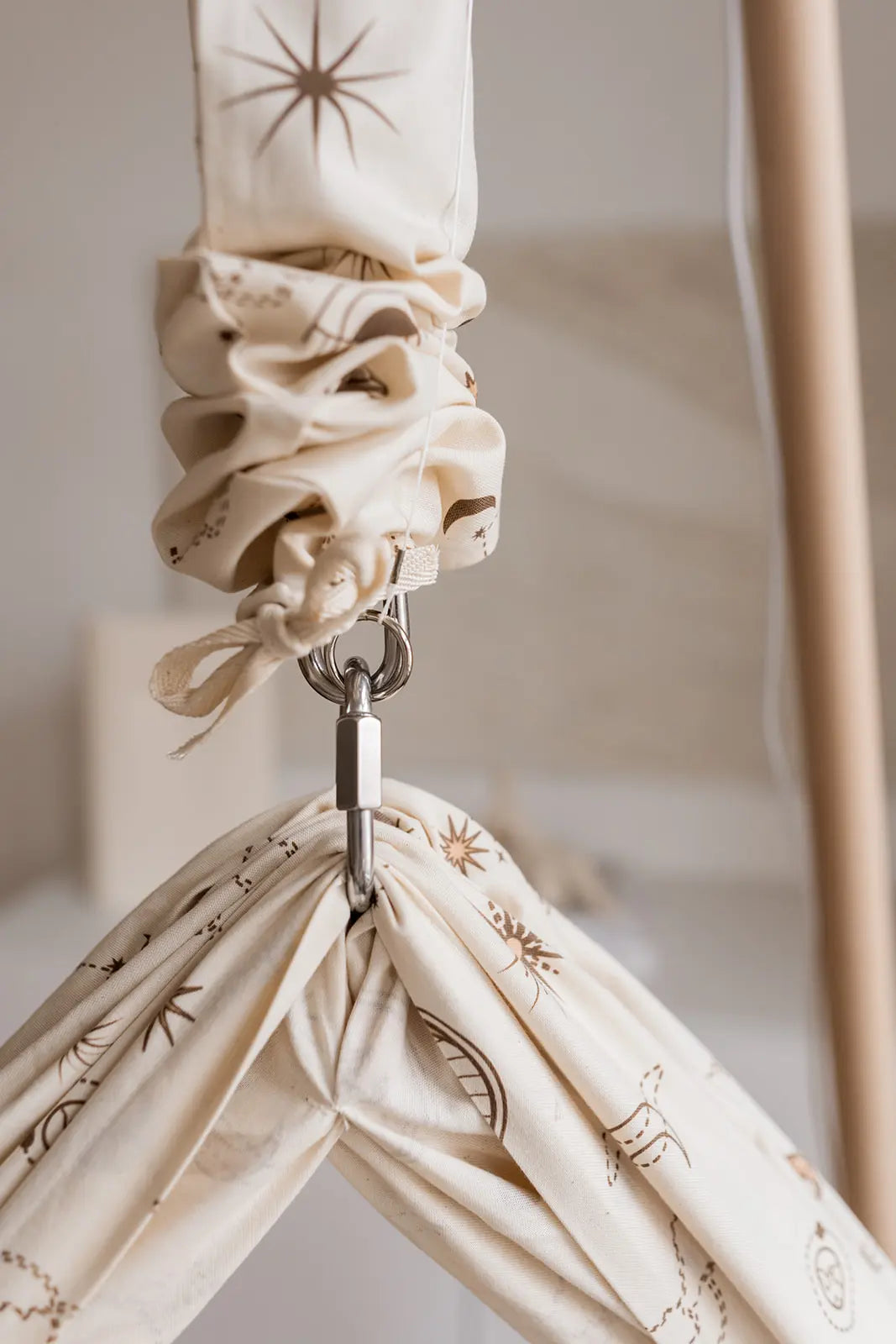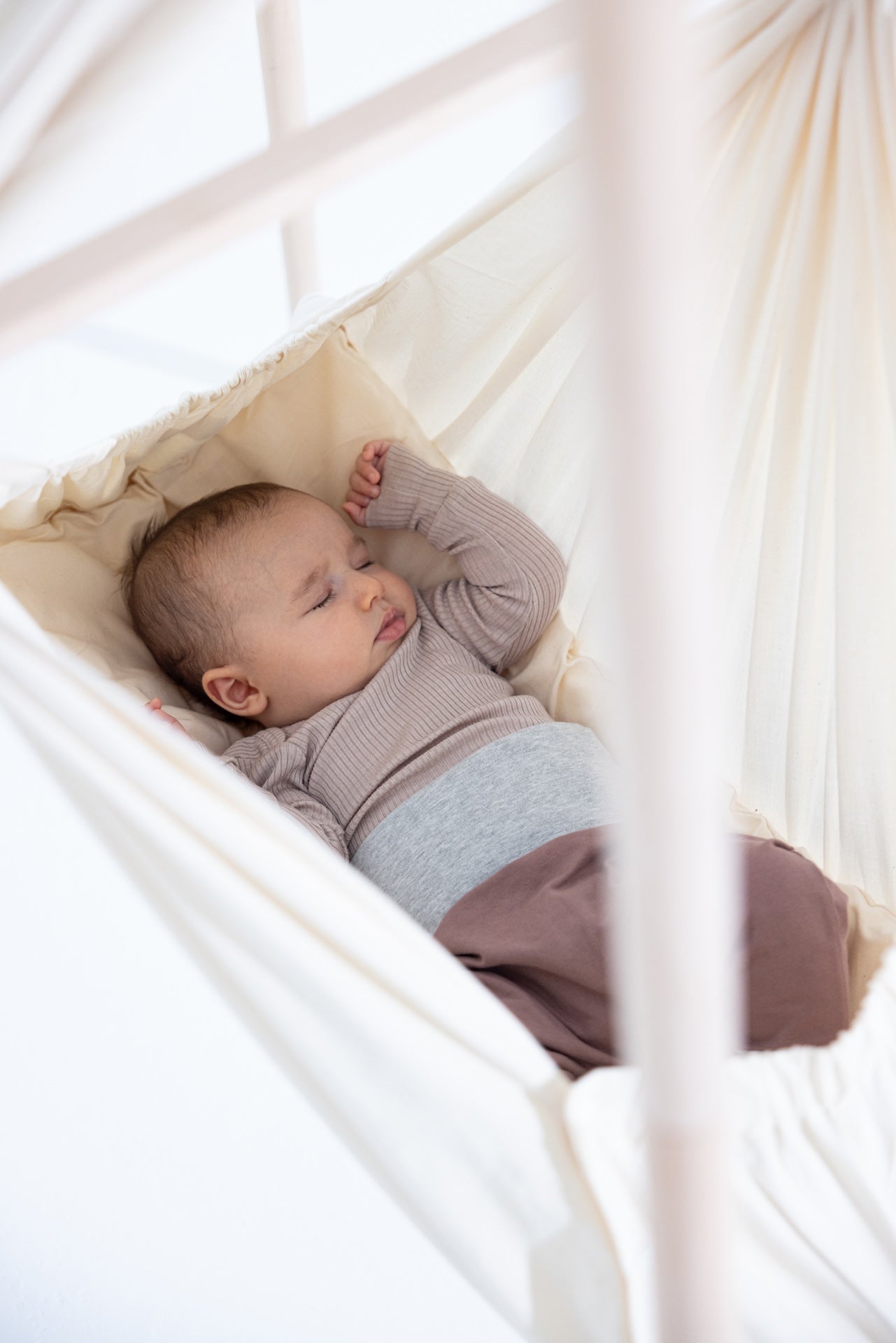 High-quality materials are crucial for your baby's well-being. The Baby Hammock or baby hammock consists of ÖKO-Text certified organic cotton and therefore offers the best quality for sensitive skin. The use of certified materials ensures that your Baby Hammock free from harmful substances iand meets the highest standards. In addition, the breathable mattress promotes a healthy sleeping position, while the combination of untreated wood of the Baby Hammock frame and safe tension spring for stability. So you can be sure that your baby is sleeping in a healthy and safe environment.